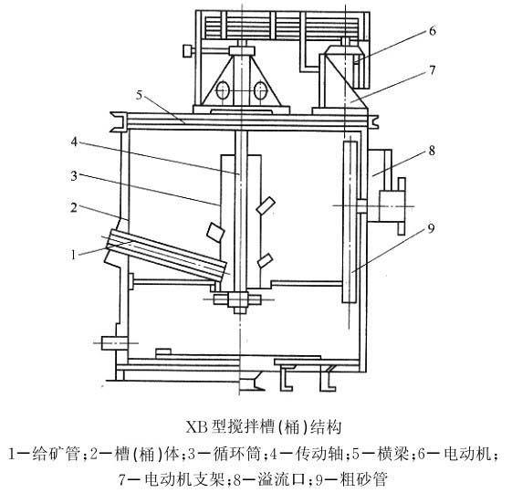 攪拌槽由豎軸部、架子、桶體部、溢流口、電動機(jī)、電動機(jī)座、電動機(jī)座組成。葉輪的旋轉(zhuǎn)是由電動機(jī)通過皮帶輪、三角帶而得到葉輪的旋轉(zhuǎn)使礦漿和藥劑攪拌均勻,通過提升裝置從排料斗流出。