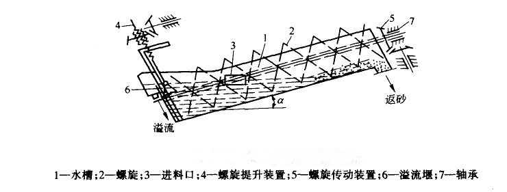螺旋分級機(jī)是借助于固體粒大小不同,比重不同,因而在液體中的沉降速度不同的原理,細(xì)礦粒浮游在水中成溢流出,粗礦粒沉于槽底。由螺旋推向上部排出,來進(jìn)行機(jī)械分級的一種分級設(shè)備,能把磨機(jī)內(nèi)磨出的料粉級于過濾,然后把粗料利用螺旋片旋片旋入磨機(jī)進(jìn)料口,把過濾出的細(xì)料從溢流管子排出。該機(jī)底座采用槽鋼,機(jī)體采用鋼板焊接而成。螺旋軸的入水頭、軸頭、采用生鐵套,耐磨耐用,提升裝置分電動和手動兩種。